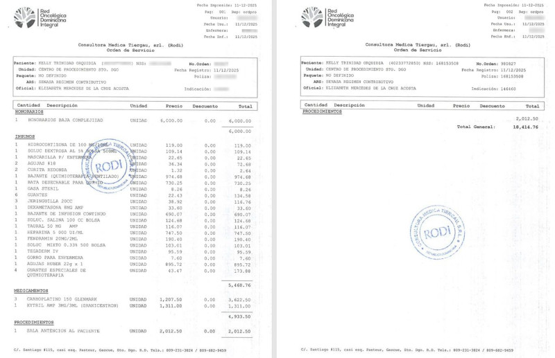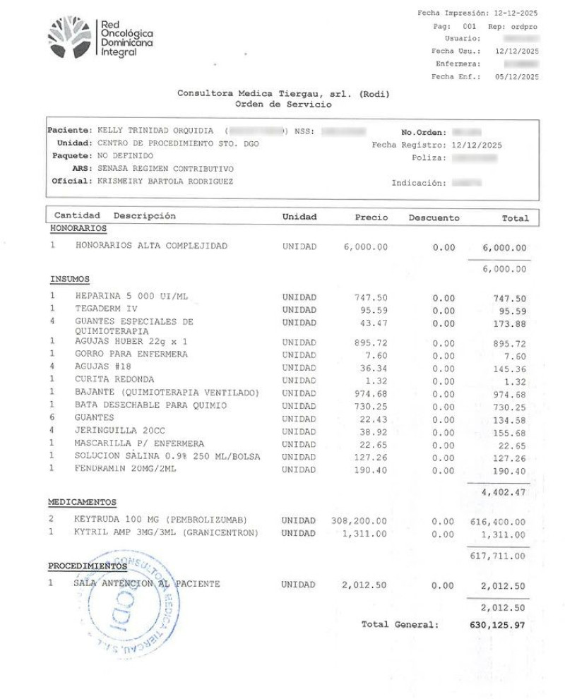 Orquídea Kelly Trinidada forma parte del seguro médico Senasa Contributivo, el cual no cubre Pembrolizumab, tratamiento oncológico indicado. Dicho tratamiento es muy costoso para Orquidia por lo que acudió al programa de Alto Costo, donde, aunque recibieron su caso, informaron que el tiempo de respuesta oscila entre 30 a 45 días, incluso puede llegar a meses.